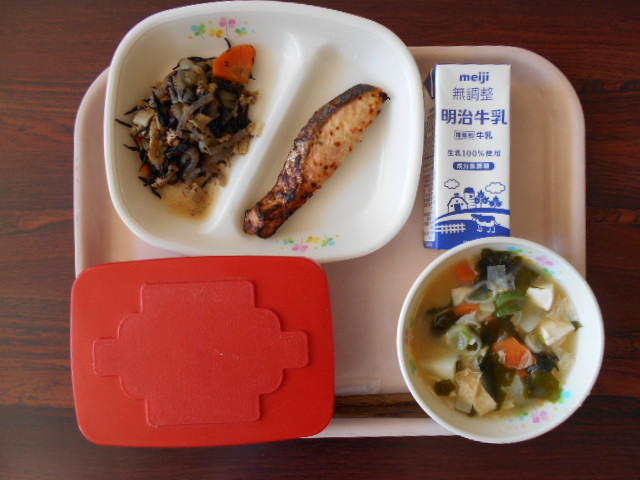 さけてりマヨづけやき、かんぴょうとひじきの炒め煮、ゆばとわかめの味噌汁等です