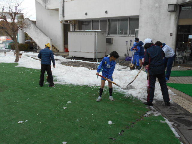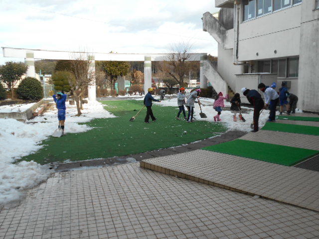 玄関の雪が凍って、なかなか溶けません。清掃の時間に、スコップを使って氷を割りながら取り除きました。残りは、明日チャレンジ。