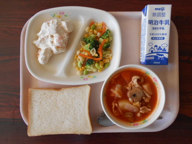 コッペパン、ミートソース、ミルメークココア、グリーンサラダ、クラムチャウダー等です。