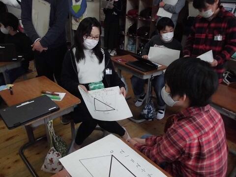 5校時、5年2組の算数科研究授業を行いました。「四角形と三角形の面積」の学習で、三角形の面積を今までに学習した図形の求め方を利用して求めることをねらいとして授業を行いました。