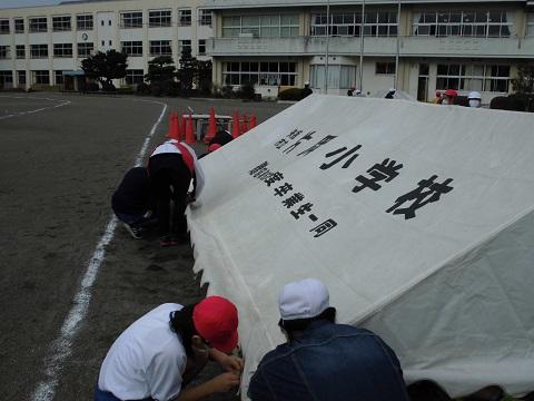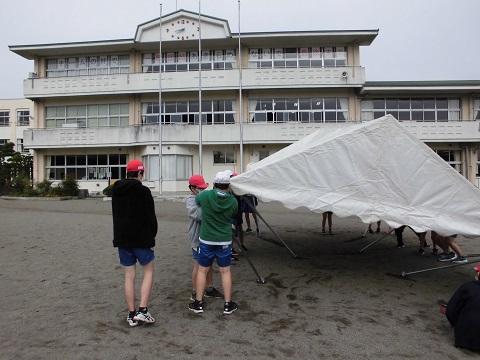 22日には6年生がテントの設営をしたり、5年生がグラウンドの石拾いをしたりしました。