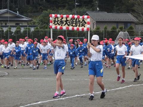 午前8時30分からの開会式では、子供たちが足並みを揃えて入場し、真剣な態度で式に臨みました。そして、紅白の団長が運動会のスローガン『チームの絆で、一致団結。あきらめないで、最後まで』の元に全力を尽くすことやスポーツマンシップにのっとり競技を行うことを堂々とした態度で宣誓しました。