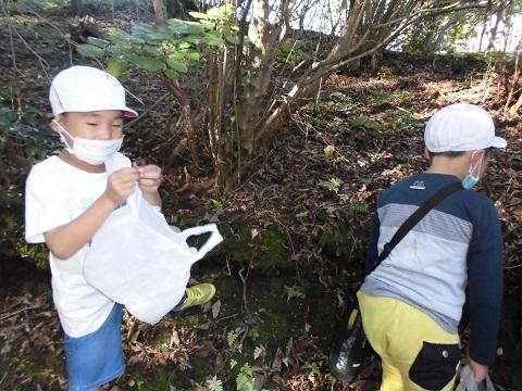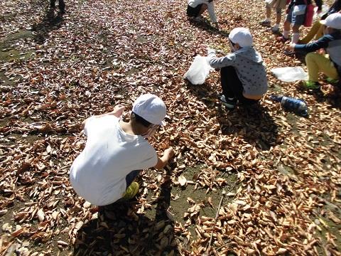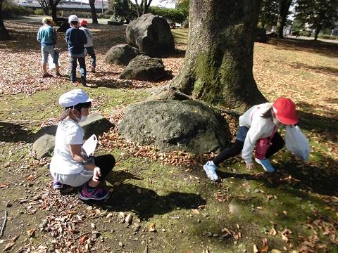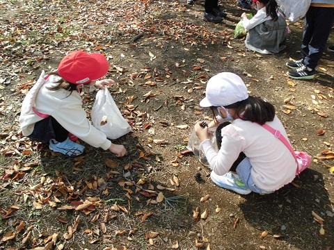 子供たちは、地面に落ちた落ち葉やドングリ、松ぼっくりなどを拾って観察したり、持ち帰ったりしました。今回の学習で、子供たちは身近な季節の変化について知ることができました。