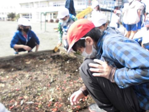 みどり活動の時間に、学級花壇にパンジーの苗を植えました。新型コロナ感染症対策のため、活動中はマスクを着用し、手洗い・消毒を活動後に行っての実施になりました。