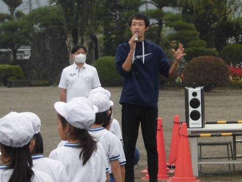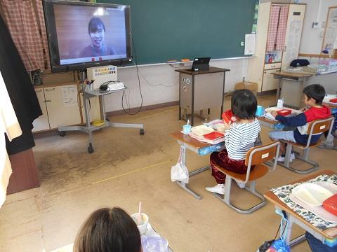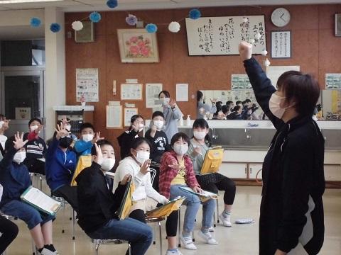 6年生は本日校外学習のため、校外学習の出発式で子供たちに自己紹介しました。また、他の学年の子供たちには給食の時間にテレビ配信で自己紹介を行いました。