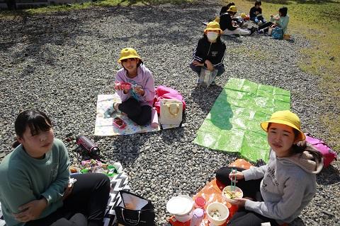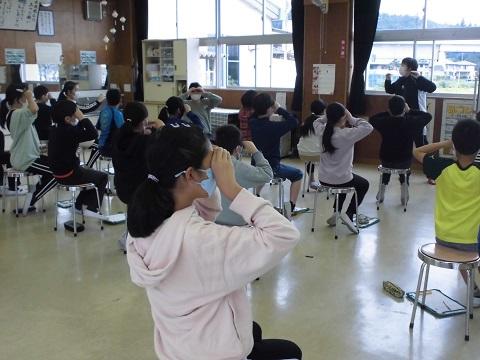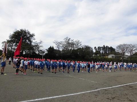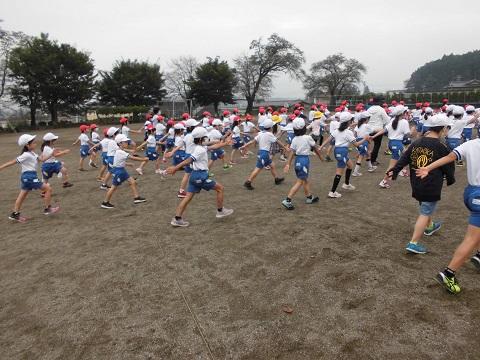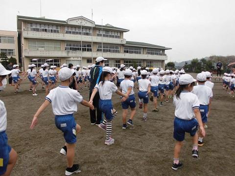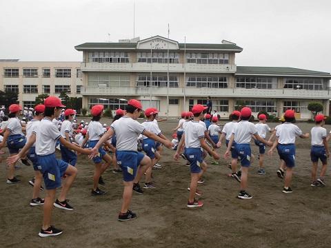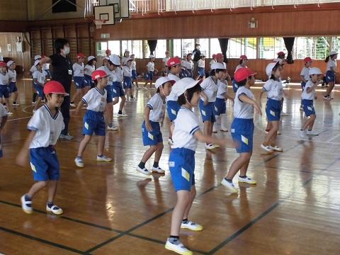 1時間目に運動会の全体練習を行いました。新型コロナ感染症対策のため、子供たちの間の距離を十分保ち、屋外での練習でした。