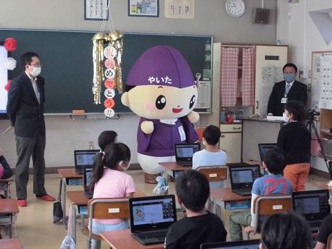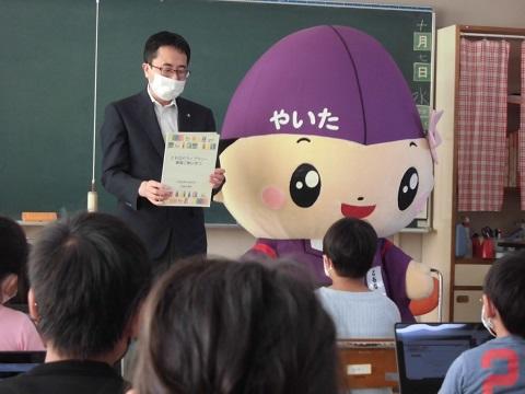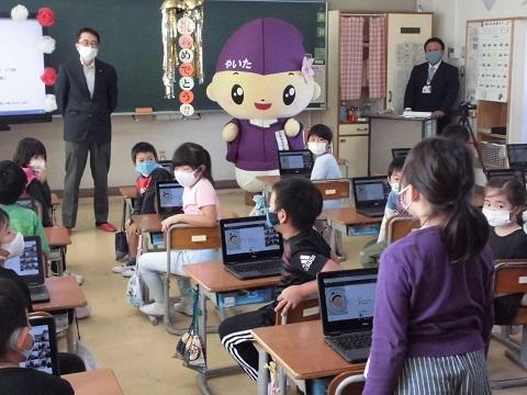 ともなりライブラリーの館長である矢板市のキャラクター、ともなりくんが突然教室に訪れ、子供たちは大興奮でした。