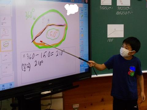 1校時、4年生の算数科研究授業を行いました。本時は「角の大きさの表し方を調べよう」の学習で、180度より大きい角度の測定の仕方を、分度器を使った角度の測り方をもとに考えて説明することができることをねらいとして展開しました。