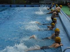 2校時には3年1組(黄キャップ)と1年生(白キャップ)がプールを使用しました。初めてプールの授業を行う1年生は、水着への着替え、プールまでの移動、プール使用の決まりなど、覚えることがたくさんあります。プールサイドで走ると危険なので厳禁なのですが、走りそうになって注意を受ける児童もいたようです。初めて浴びたプールのシャワーは冷たかったと思います。でも、楽しそうでした。水に慣れ、泳力を身につけられるよう願っています。3校時には3年2組と2年生が、4校時には4年生がそれぞれプールを使用しました。5校時には5年生と6年生が使用する予定になっています。