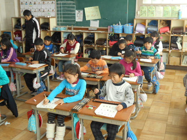 1校時3年1組、2校時3年2組、3校時4年1組、4校時4年2組で、そろばんの学習をしました。