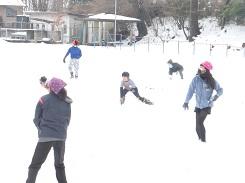 本日の昼休みの様子です。校庭に積もった雪で、児童達は楽しそうに遊んでいました。雪合戦のように、雪を投げ合う児童の姿を多く見ました。何人かは雪だるまを作ろうとして雪の玉を転がしていましたが、雪だるまの形にはならなかったようです。