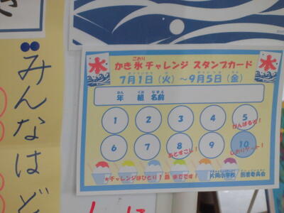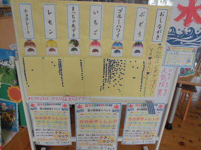 現在、図書委員会によるイベントを開催しています。本を読んでスタンプを集めると、夏らしい手作りの「かき氷のしおり」がもらえます。子どもたちに人気のあるしおりは、ブルーハワイのかき氷のしおりです。夏休みは一人2冊本を借りることができます。たくさん読んで、心を豊かにしてください。