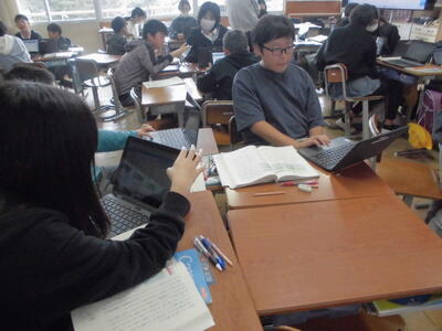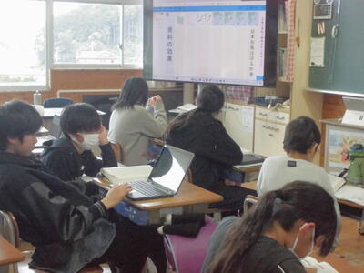 5年生の国語科の授業の様子です。この授業は、「資料と文章を関連付けてまとめることができる。」がねらいです。子どもたちは協働的な活動を通して、ねらいを達成しようとしていました。ICTを効果的に活用しながら、授業は進められていました。