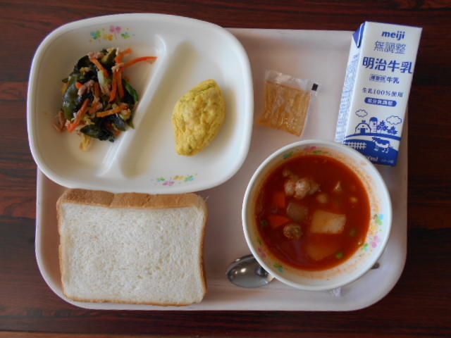 食パン、リンゴジャム、オムレツ、白菜サラダ、ポークビーンズ等です。