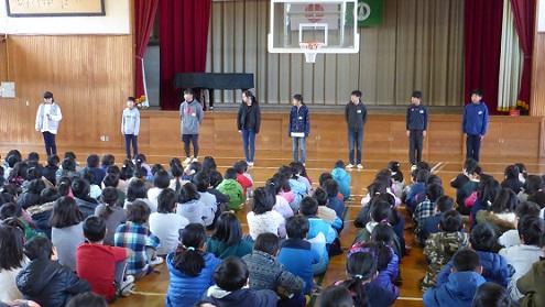 児童集会 投稿日時 : 2018/01/10 片小管理者 カテゴリ: 1月10日の朝、児童集会を体育館で行いました。 今回の児童集会では、司会進行を児童会の運営委員会が担当して、後期の委員長さんが自己紹介と委員会からのお知らせを行いました。 それぞれの委員長さんは児童の前に並び、1人1人がしっかりと発表できました。また、寒さ厳しい中でしたが、児童はしっかりと話を聞くことが出来ました。 後期の委員長さん、よろしくお願いします。