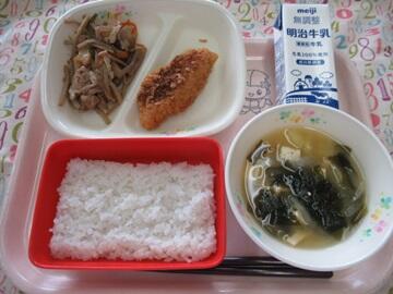 【今日の献立】ごはん 牛乳 白身魚フライ 五目きんぴら じゃがいもとわかめのみそ汁