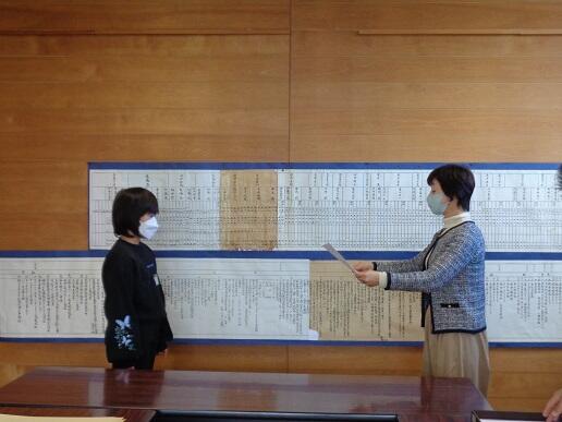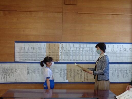 2月14日(火)12:50~13:00 塩谷地区書初め展上位入賞者表彰を校長室で行いました。表彰に先立ちお昼の放送で特賞1名、金賞1名、銀賞4名、銅賞3名、入選11名の児童の名前を紹介しました。特賞、金賞、銀賞の児童が代表で賞状を授与しました。受賞した皆さん、おめでとうございます。