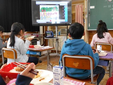 それに合わせて、給食の時間にオンライン配信で「しもつかれ」が栃木県で食べられるようになった由来や「しもつかれ」に使われている材料、調理室でどのように作られているかなどを紙芝居や写真で説明しました。