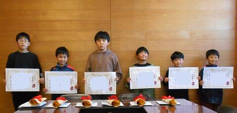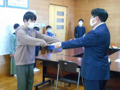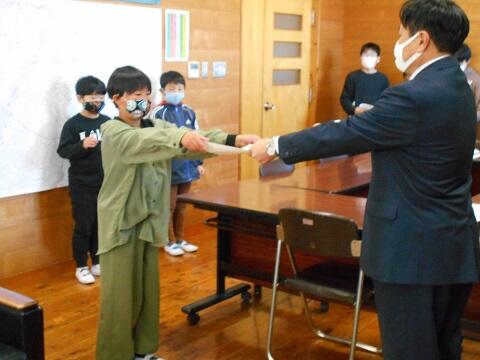 新型コロナ感染症対策のため、入選した児童は給食の時間に放送での発表を行い、昼休みに校長室で大賞や準大賞、奨励賞を受賞した6名の児童の表彰を行いました。今回は27名の児童が入選以上に選ばれました。子供たちは、立派な態度で表彰に臨み、笑顔で賞状を受け取りました。