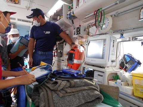 新型コロナ感染症対策に配慮し、マスクをしたりソーシャルディスタンスに気を付けたりしながら、救急車や化学消防車などのすぐ近くで説明を聞きました。また、救急車の内部見学をしたり、放水訓練を間近で見たりもしました。