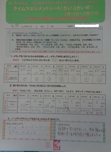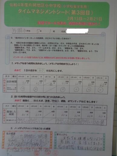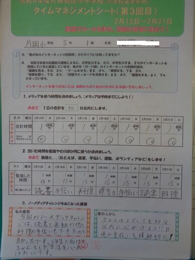 2月に実施した「第3回タイムマネジメントカード」を紹介します。片岡中学校区の4つの学校(片岡中学校・片岡小学校・安沢小学校・乙畑小学校)で、家庭での生活時間を見直し、家庭学習・読書・手伝い・運動・家庭団らん・その他の時間にあて、時間を有効活用しようという取り組みです。表面をアットランダムで紹介します。