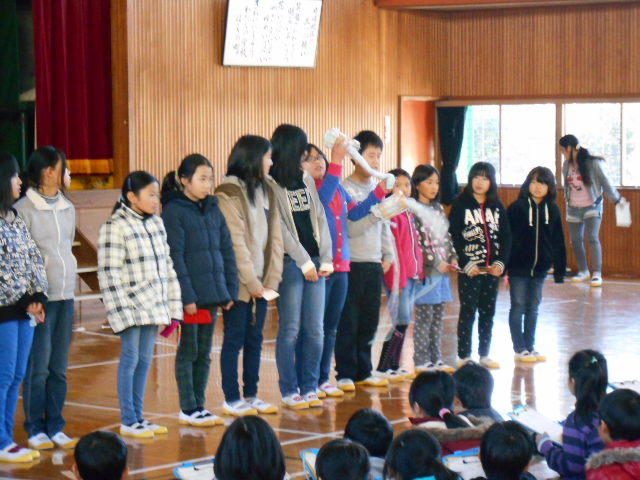 今朝は、体育館で、1・4年生の群読の発表集会がありました。