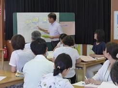 放課後は、行った授業についての研究会を行いました。小グループ毎に「実践の難易さ」と「教育効果の高さ」を観点とした分析を行い、理解を深め合うことができました。今後の授業実践に役立つ研修になったと思います。