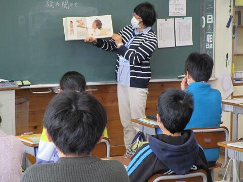 朝の活動の時間に、「お話ポッドの会」の方々による読み聞かせを行いました。