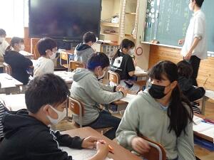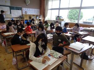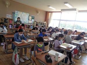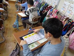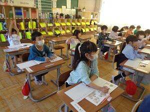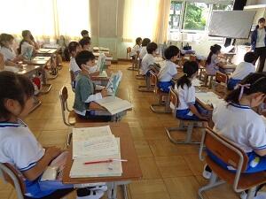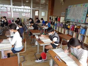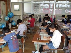 1校時の授業が始まるとサッと授業に集中できる5年生。メリハリのある行動ができています。