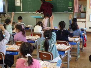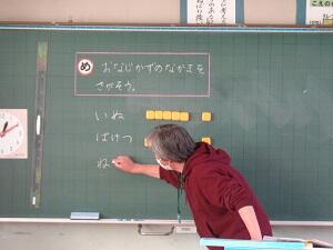 1年生の算数授業の様子。教科書の挿絵を使って、動物や物がいくつあるかを数えました。数える対象におはじきを置きながら、子ども達はいくつあるかをきちんと理解していました。