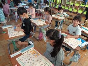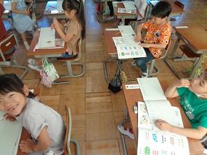 子ども達はこのような学習が大好きです。漢字クイズの後は、ドリルに真剣に取り組みました。