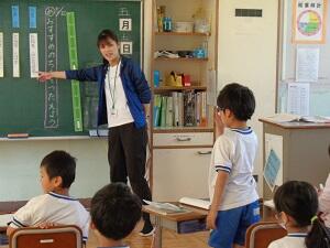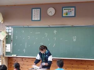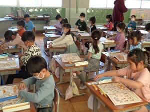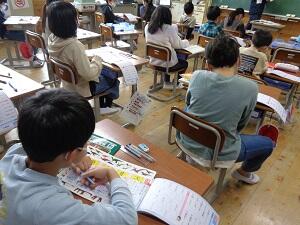 ミニ先生となった児童が漢字の読み方や書き順を説明し、担任の先生の指示によって全員で書き順を確かめました。どの児童も真剣に学んでいます。
