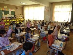 先生の話を聞くときは「手を膝の上」に置き、積極的に手を挙げて発表する1年生の姿がたくさん見られました。
