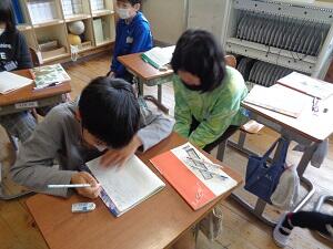 昼休みの図書室に行ってみると、図書委員会の児童が「本の整理」や「ラベル貼り」に取り組んでいました。責任をもって活動する姿に高学年としての自覚がうかがえます。