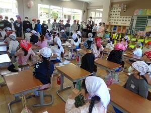 生活科校外学習で、乙畑小学校の1・2年生が調理室を見学に来ました。初めにランチルームで給食担当の先生からお話を聞き、その後に調理室を見学しました。