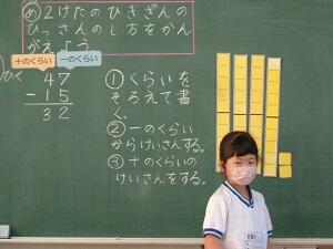 2年生の算数授業の様子。「2けたひき算のひっ算のし方を考えよう」というめあてで授業が進められました。