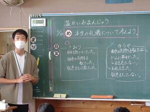 6年生の道徳授業。「本当の礼儀について考えよう」というめあてで、教科書の登場人物の行動を通して礼儀について考えました。