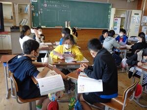 6年生の国語授業の様子。グループごとに話し合うテーマを設定し、互いの意見を交流しました。
