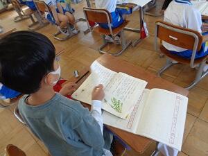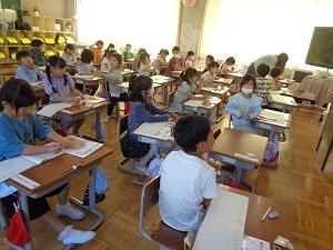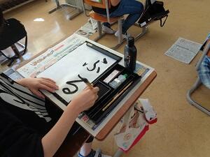 4組の書写授業の様子。この日も習字に取り組んでいました。4年生は「ふるさと」という字を書き、2年生は毛筆に慣れる練習をしました。