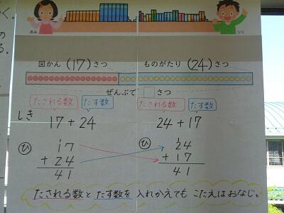 子ども達は、自分のノートに筆算のやり方を考え、グループや全体で確認し合いました。