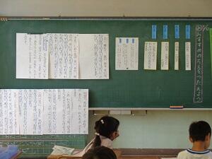 4年国語授業の様子。説明文「アップとルーズ」を読み、子ども達は「筆者に対する自分の考え」をまとめていきました。