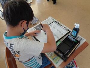 3年生の教室を訪問すると、遠足の思い出を新聞にまとめていました。担任の先生が準備した「手本」を参考にして、一人一人が真剣に取り組んでいます。
