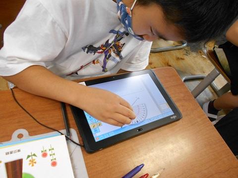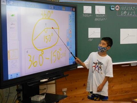 1校時、4年生の算数科研究授業を行いました。本時は「角の大きさの表し方を調べよう」の学習で、180度より大きい角度の測定の仕方を、分度器を使った角度の測り方をもとに考えて説明することができることをねらいとして展開しました。