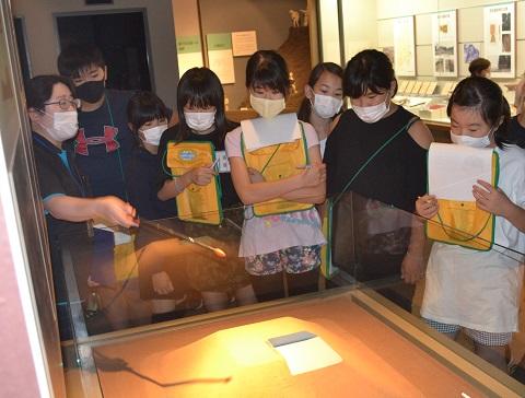 午後は、なす風土記の丘資料館小川館で昼食を取った後、小川館内を見学しました。子供たちはそれぞれのグループで楽しく昼食を食べ終えると、館内の展示物や体験コーナーを目を輝かせながら見学しました。