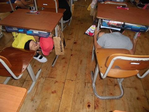 地震発生の訓練用アナウンスが聞こえると、子供たちは即座に机の下に隠れて頭部を守る行動に出ることができました。地震発生後の校舎から校庭への避難も、黙って素早く移動することができました。