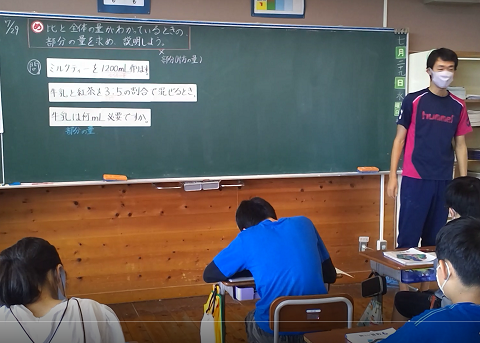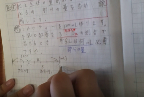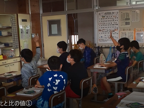 2校時、6年生の算数科研究授業を行いました。本時は「割合の表し方を調べよう」の学習で、全体の量を比例配分する方法を考え、説明できることをねらいとして展開しました。