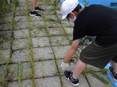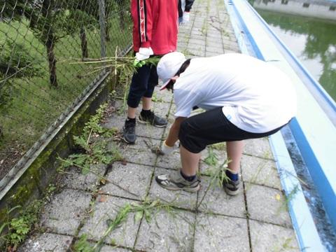 昼休みに6年生の子供たちがプールサイドの除草を行いました。