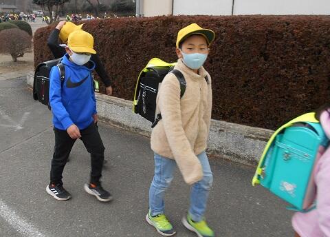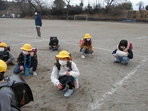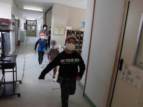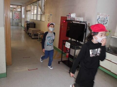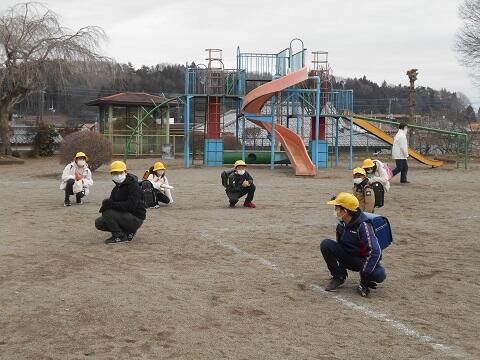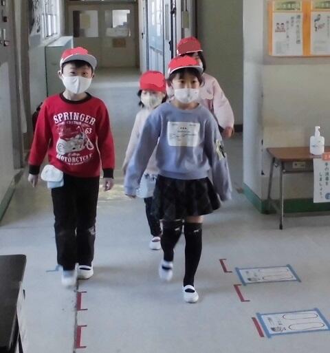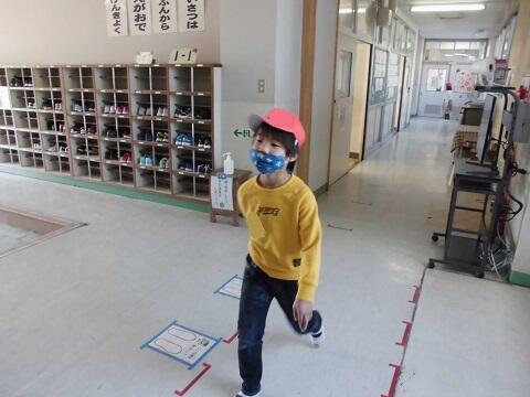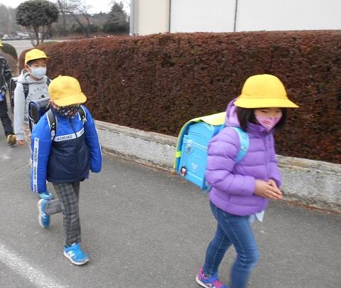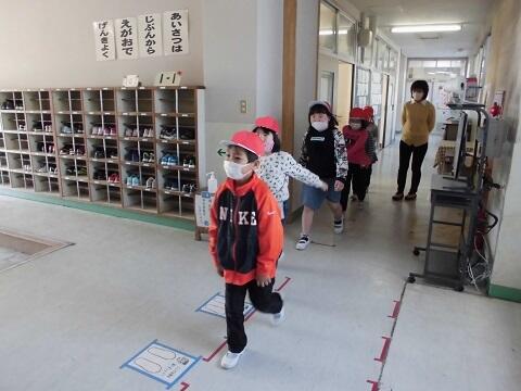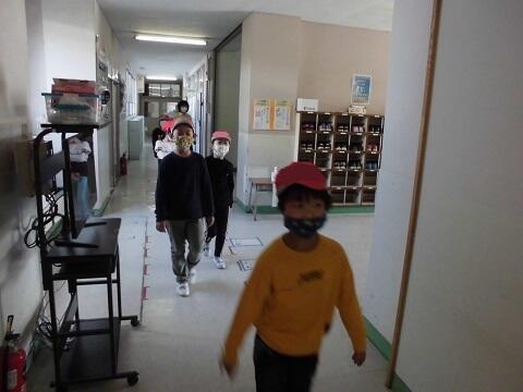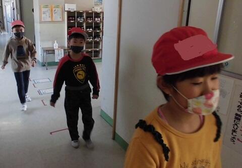 新型コロナウイルス感染症対策のため、登校班で並ぶ際には児童同士が十分な距離を保って座り、登下校のときにもマスクを着用をして、距離をとることを確認して下校しました。