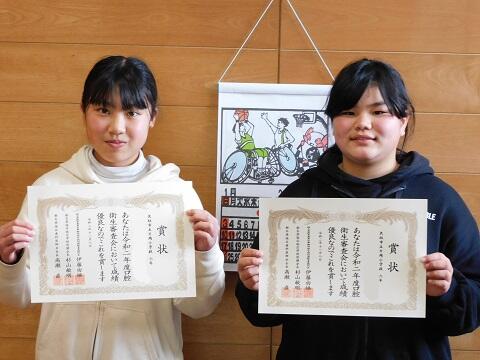表彰された児童名を、給食の時間に放送で発表し、昼休みに校長室で、6年生の代表児童2名に賞状を伝達しました。