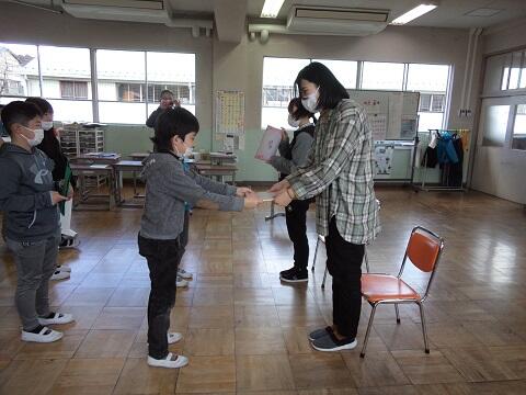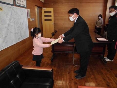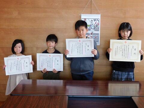 昼休みに、校長室で第72回塩谷地区書初め展に入選した児童の代表に賞状を伝達しました。